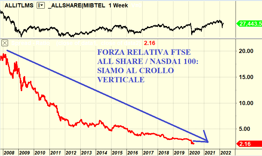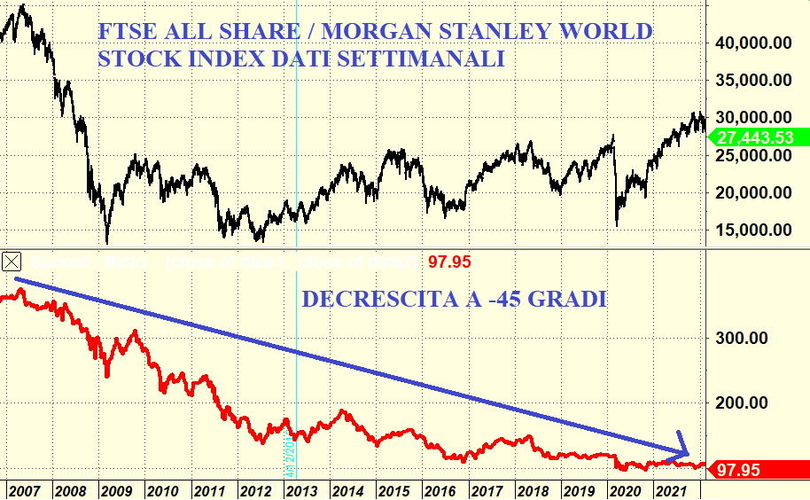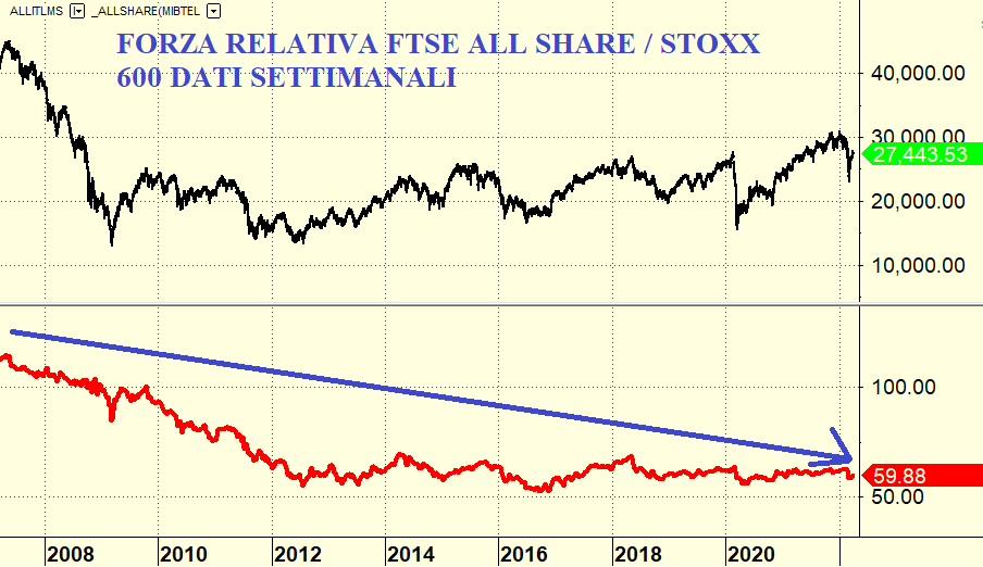 Non conviene comprare azioni italiane. Questa è la triste realtà del nostro mercato azionario. Dobbiamo fare pubblica ammenda: speravamo che con il post Covid l’economia italiana tornasse a pompare al rialzo e finalmente il nostro indice Ftse All Share potesse tornare a quota 40.000. Come l’ha definita un noto giornalista economico italiano, Fabrizio Galimberti, l’economia italiana è come un calabrone, dovrebbe non riuscire a volare secondo la fisica eppure vola. Ma ci siamo sbagliati. Se facciamo una analisi di forza relativa la nostra Borsa è una carta perdente. Non è questa una opinione o un commento ardito di un editorialista e corto di idee. E’ la triste verità. E questo già prima della crisi energetica figuriamoci ora con Putin che minaccia di chiudere i gasdotti. Siamo in braghe di tela. Per forza relativa intendiamo semplicemente un rapporto dove al numeratore abbiamo il nostro Ftse All Share ed al denominatore abbiamo un indice straniero. Iniziamo questa danza macabra con il primo grafico: