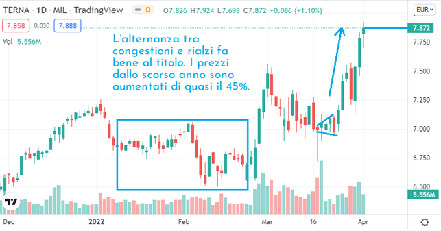 Segnaliamo oggi Le Azioni Terna che si spingono sempre più su, fino a rompere i massimi storici raggiungendo un prezzo di 7.872 euro. La storia dell'azione, come possiamo vedere dal grafico, è un susseguirsi tra congestioni e rialzi: come il pit stop durante una gara, le orizzontalizzazioni sembrano servire solo a ricaricare le batterie per poi ripartire nella corsa. Tutto è come dovrebbe essere: i volumi sono abbondanti, la spinta è indiscutibilmente forte, i prezzi crescono progressivamente. E' del 24 marzo (giorno che NON casualmente ha preceduto l'ultimo rialzo) la comunicazione dell'approvazione dell'aggiornamento del piano industriale 2021-2025 di Terna. Nel periodo in esame la società prevede di investire complessivamente 10 miliardi di euro, di cui 1,7 miliardi nell'esercizio in corso. Sulla base della strategia, Terna stima che ricavi e Ebitda nel 2025 possano raggiungere rispettivamente i 3,08 e 2,14 miliardi di euro, con una crescita media annua di oltre il 3%.
