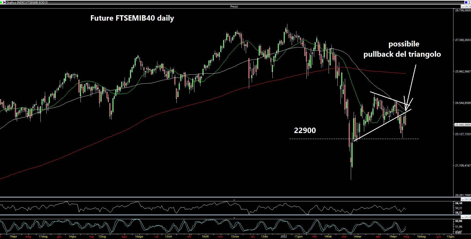 La settimana scorsa scrivevo che non mi entusiasmava particolarmente il tentativo di uscita (o forzatura) del triangolo daily sul nostro future FTSEMIB40 e quindi anche sull'indice. Così è stato infatti già nella seduta di lunedì mattina abbiamo avuto il primo affondo con un tentativo di recupero che è poi evidentemente fallito già il giorno successivo. Paradossale il comportamento da mercoledì a venerdì: recupero dei massimi settimanali (ennesima caccia agli stop) e poi nuovamente giù. Rimane interessante però notare che proprio con il tentativo di recupero di giovedì e venerdì mattina pare si possa configurare un pullback sulla parte bassa del triangolo daily. Attenzione in caso di nuovo avvicinamento ai 22900 punti e ad un eventuale stazionamento in quella zona per più sedute. Questo potrebbe infatti portare ad un ulteriore concreto e notevole indebolimento del nostro listino, anche in considerazione delle problematiche macro che conosciamo (guerra, problema energetico, spread a 180 e così via). Faccio poi notare con piacere che, come ho avuto modo di scrivere svariate volte su queste colonne, l'economia (italiana) sta dando segnali di notevole rallentamento, con un PIL sceso dello 0.2% nel primo trimestre. Nelle prossime settimane si dirà che è colpa della guerra (che certamente ha influito ed influirà), peccato che la problematica comune tocca molto meno altre nazioni. E qui si viene al solito ed annoso punto dolente. L'economia italiana non può che mostrare la sua debolezza cronica: troppi vincoli e troppi balzelli che demotivano ad avviare nuove attività (ma che di contro motivano a chiudere i battenti quanto prima e questo è evidenziato da un dato oggettivo: il tasso annuo di mortalità imprenditoriale). In tutto questo la Borsa Iialiana espressa dall'indice principale FTSEMIB40 è una grande maestra: nelle fasi di forti rialzi di mercato abbiamo sempre sottoperformato e in quelle di ribasso abbiamo fatto peggio. Vuoi per la composizione del nostro indice, vuoi per la totale assenza di appeal.