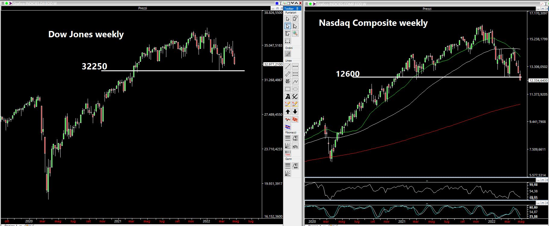 Purtroppo la settimana passata indicavo i 12600 come direzione naturale del Nasdaq. Ci siamo arrivati velocemente, salvo un tentennamento nella seduta di giovedì. Il close weekly è stato ben al di sotto a 12334 e su scala settimanale anche il Dow Jones pare sia attratto dai 32250. Le pessime chiusure generalizzate di ieri (venerdì,ndr) non lasciano molto ben sperare ed è quindi possibile un ulteriore indebolimento del quadro tecnico.