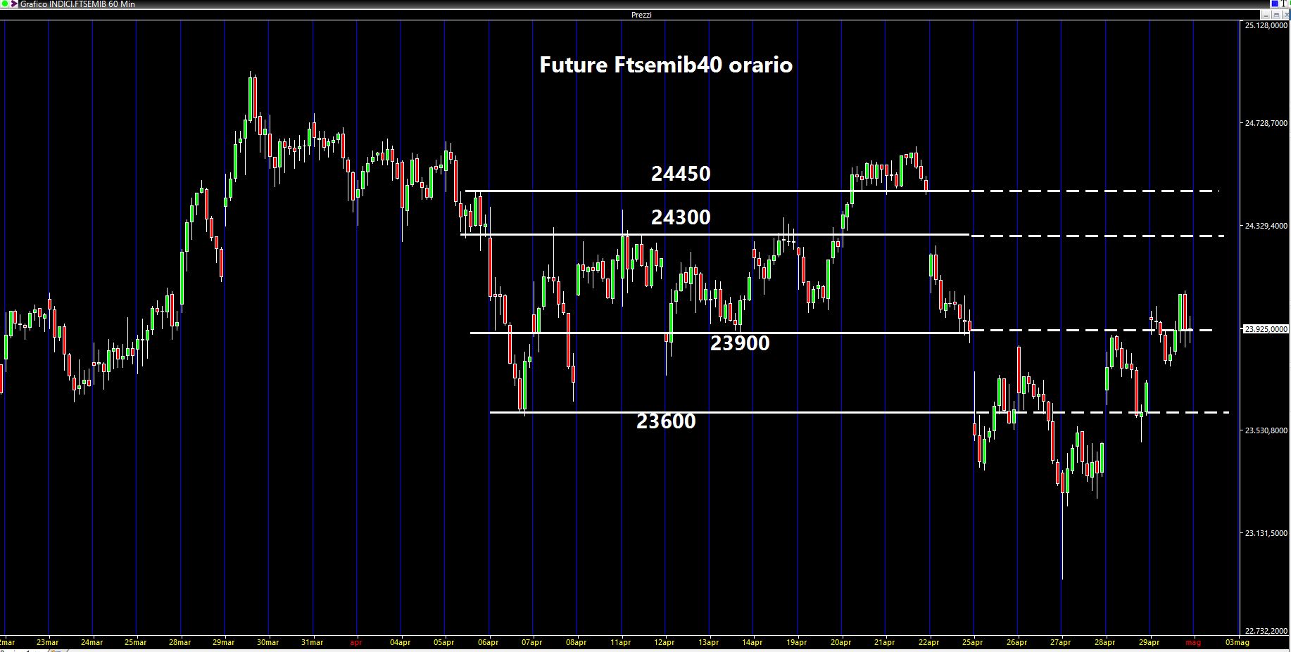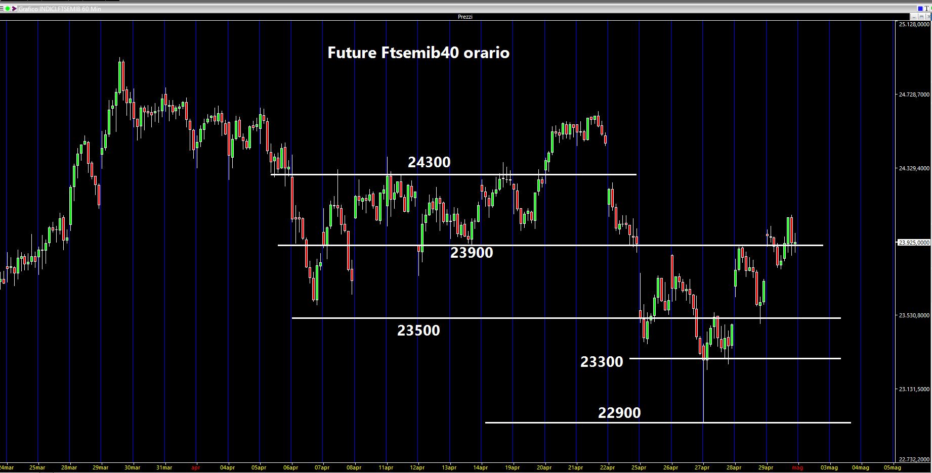Per la prossima ottava monitorerò i seguenti livelli di Future FTSEMIB40 su scala oraria: sempre attenzione ai 24300 al rialzo (molto difficile che vengano toccati) che però necessitano della tenuta stabile sopra i 23900. Credo però che la partita si giocherà tra 23500 e 23300, quindi al ribasso, considerando anche un mercato driver come quello statunitense.