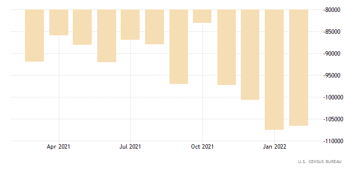 Il dato mensile preliminare di febbraio sulla bilancia commerciale USA (la differenza dei valori di beni importati ed esportati) si attesta a -106,59 miliardi di dollari, un deficit inferiore a quello registrato a gennaio pari a -107,57 miliardi di dollari (rivisto da -107,63 miliardi di dollari). Il dato è rilasciato dall’U.S. Census Bureau.