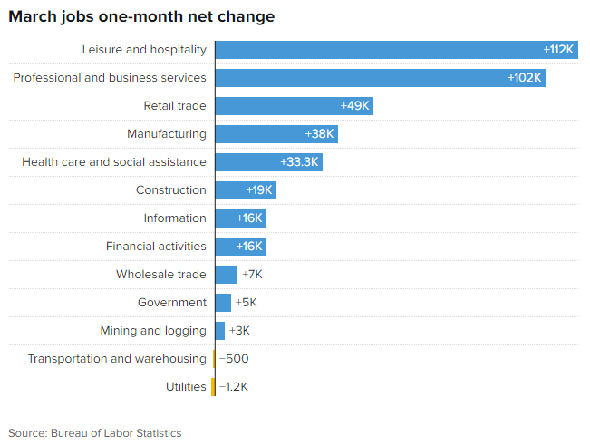 Con l’allentamento delle restrizioni legate al Covid, il mese scorso sono proseguiti i rimbalzi nei settori del tempo libero, dell’ospitalità e degli affari e hanno contribuito a generare un forte rapporto sull’occupazione di marzo. Il rapporto sull’occupazione di marzo 2022 ha mostrato che il settore del tempo libero e dell’ospitalità, che comprende hotel, ristoranti e parchi di divertimento, ha aggiunto 112.000 posti di lavoro netti. L’ampio settore sanitario e dei servizi sociali ha aggiunto più di 30.000 a marzo 2022 grazie all’assunzione di operatori dei servizi sociali, che includono personale di assistenza all’infanzia.