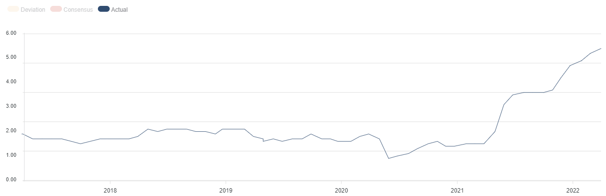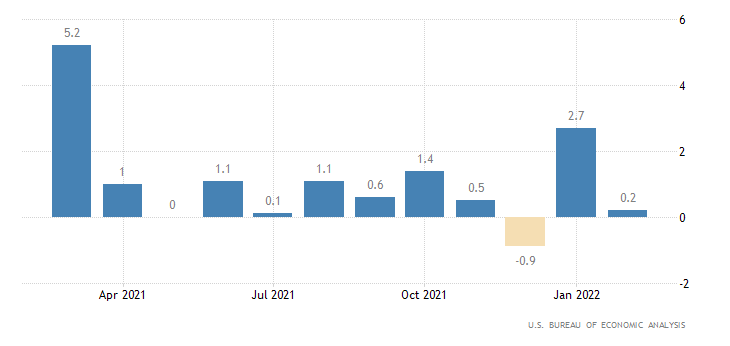 A livello annualizzato a febbraio la crescita è del 5,4%, vale a dire poco inferiore al consensus del +5,5%, ma superiore al rialzo del +5,2% di gennaio. I due dati sono rilasciati dall’U.S. Bureau of Economic Analysis.