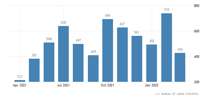 Nel settore non-agricolo privato i nuovi posti di lavoro registrati nel mese di marzo sono stati 426 mila, anche in questo caso si tratta di un dato inferiore al consensus, fissato a 480 mila, ed inferiore al dato di febbraio di 739 mila (rivisto da 654 mila). I dati sono rilasciati dall’U.S. Bureau of Labor Statistics.