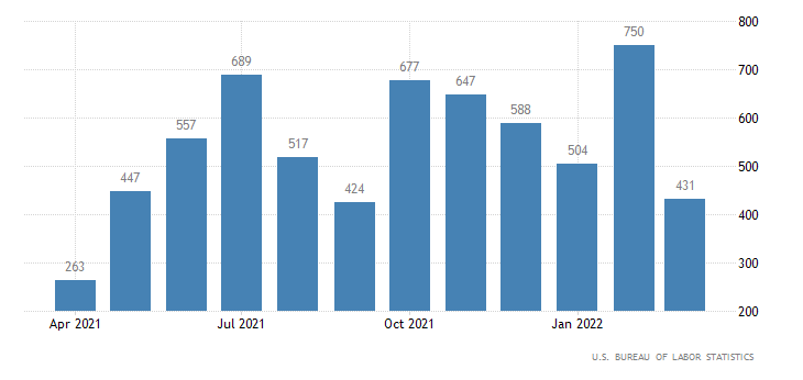 Nel settore non-agricolo pubblico a marzo sono stati creati 431 mila posti di lavoro. Un numero inferiore alle attese di 490 mila nuovi posti di lavoro, ma che segna anche un deciso calo rispetto al mese di febbraio quando il dato si era attestato a 750 mila (rivisto da 678 mila).