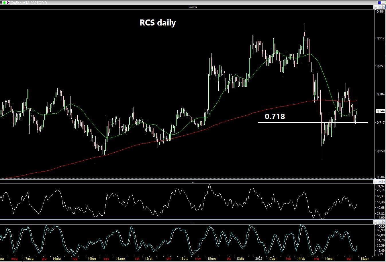 Sempre sabato scorso avevo ricordato di utilizzare uno stop anche sul titolo RCS che comunque aveva già raggiunto il primo target posto a 0.80 euro e quindi un po' di profit lo ha dato. Lo stop, posto a 0.718, è stato toccato e rotto in intraday anche se RCS ha chiuso sopra il livello medesimo. Giusto o sbagliato stopparsi ? Col raggiungimento del primo target e dello stop potremmo dire "uno a uno, palla al centro". Personalmente opto per i trades che tendono ad andare e proseguire nella giusta direzione fin da subito e senza molti indugi. Qui purtroppo c'è stato qualche tentennamento di troppo anche se rimangono valide le considerazioni sul profilo fondamentale.