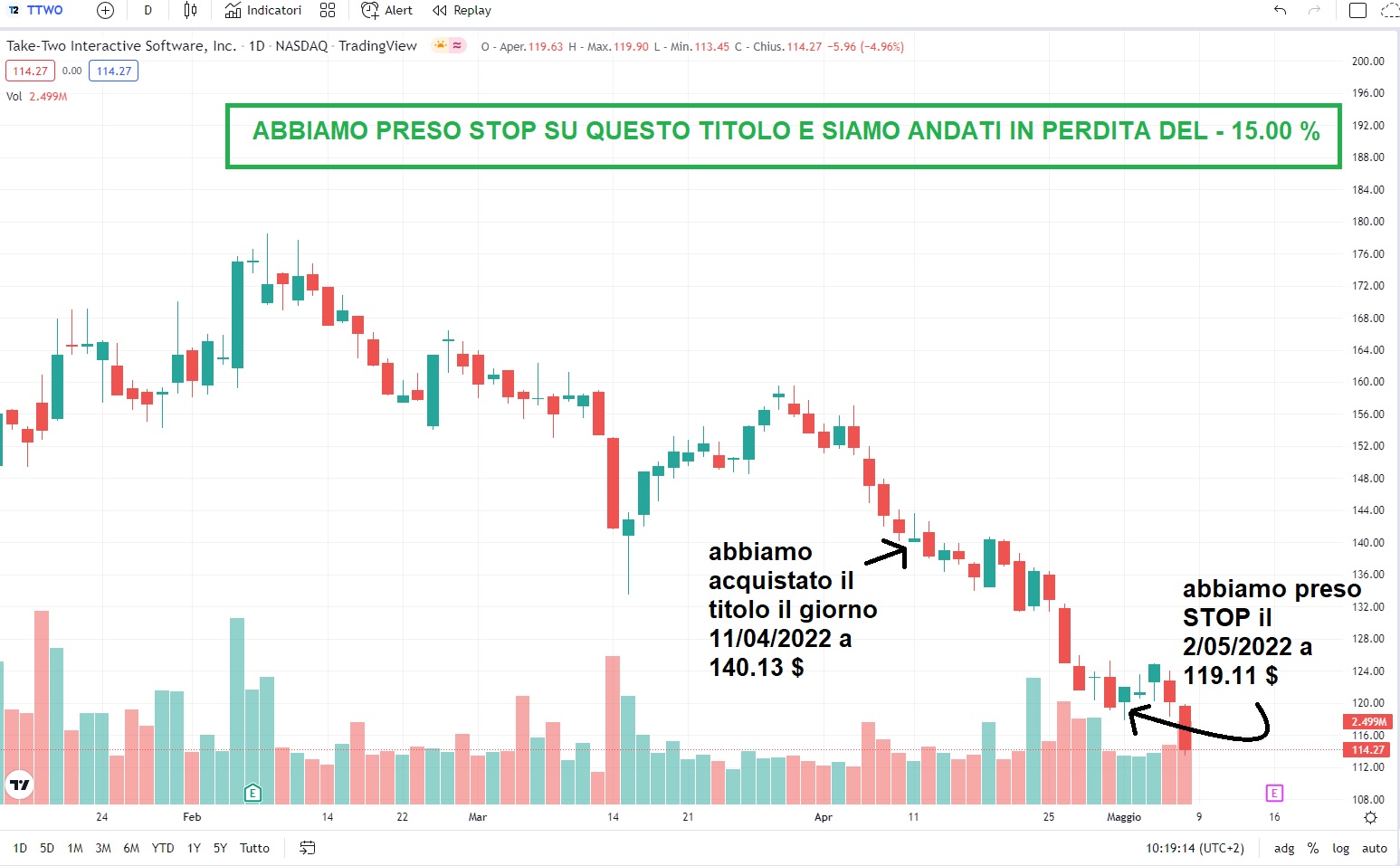 Siamo entrati in acquisto il giorno 11/04/2022 ad un prezzo di 140.13 $ e abbiamo subito lo stop il giorno 2/05/2022 ad un prezzo di 119.11 $ concludendo il trade in perdita del – 15.00 %.