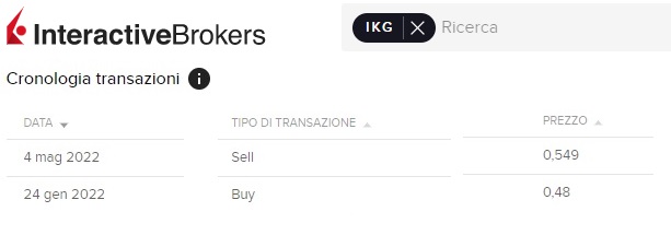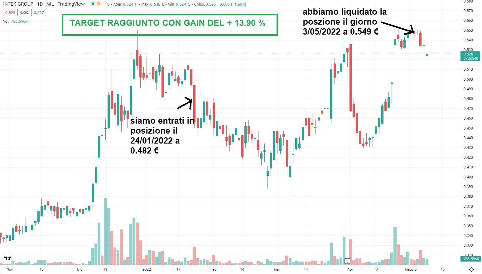 In questo caso siamo entrati in posizione il giorno 24/01/2022 al prezzo di 0.482 € e siamo usciti liquidando il titolo il giorno 3/05/2022 al prezzo di 0.549 €.