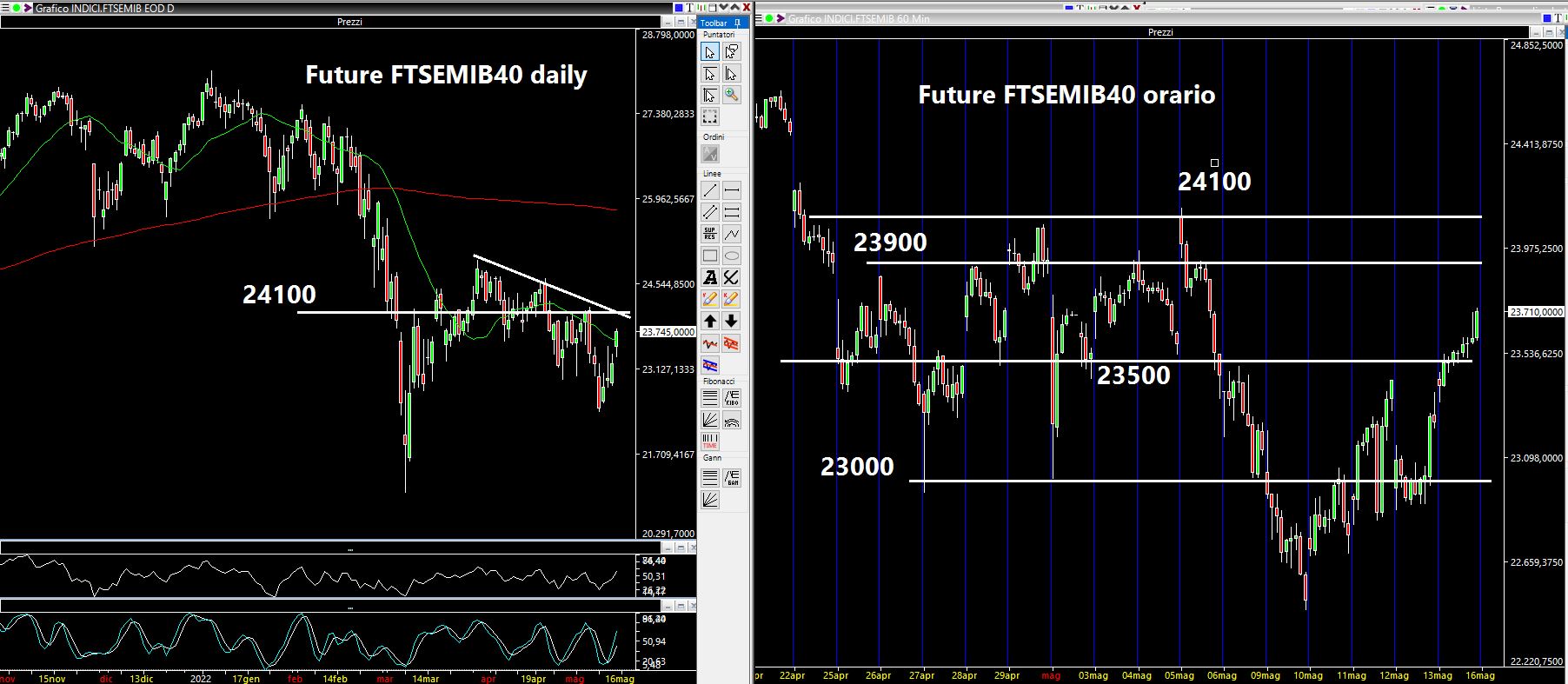 Buon sabato a tutte le lettrici e lettori. Inizierei subito dal comportamento dei livelli previsionali tracciati sul nostro Future FTSEMIB40 naturalmente sulla scadenza di giugno (link articolo: https://www.lombardreport.com/2022/5/7/commento-settimanale-35/ ). Per prima cosa osserviamo come il mercato non abbia inizialmente tenuto i 23000 nelle sedute di lunedì e martedì e solo la successiva tenuta dei 23000 come indicato nell'update di metà settimana (link: https://www.lombardreport.com/2022/5/10/come-un-gelato-sotto-il-sole/) ha permesso al nostro indice un inaspettato tentativo di allungo, certamente favorito dalla buona performance di alcuni titoli del settore bancario, Unicredit in primis, grazie al piano di buyback annunciato. Come sempre le linee tratteggiate rappresentano il comportamento dei livelli "previsti" sabato scorso.
