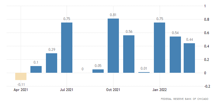 Il Chicago Fed National Activity Index, rilasciato dalla Federal Reserve Bank di Chicago, passa dal dato di 0,54 di febbraio (rivisto da 0,51) a quello di 0,44 di marzo.