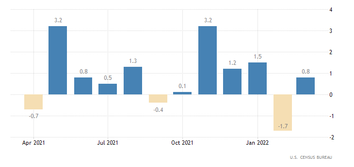 Dopo la contrazione dell’1,7% di febbraio (dato rivisto da -2,2%), gli ordini di beni durevoli a marzo registrano un +0,8% a livello mensile, ovvero una crescita appena inferiore a quella dell’1% indicata dal consensus a dimostrazione che il CAPEX (spese in conto capitale) al momento tiene negli States. Il dato è rilasciato dall’U.S. Census Bureau.