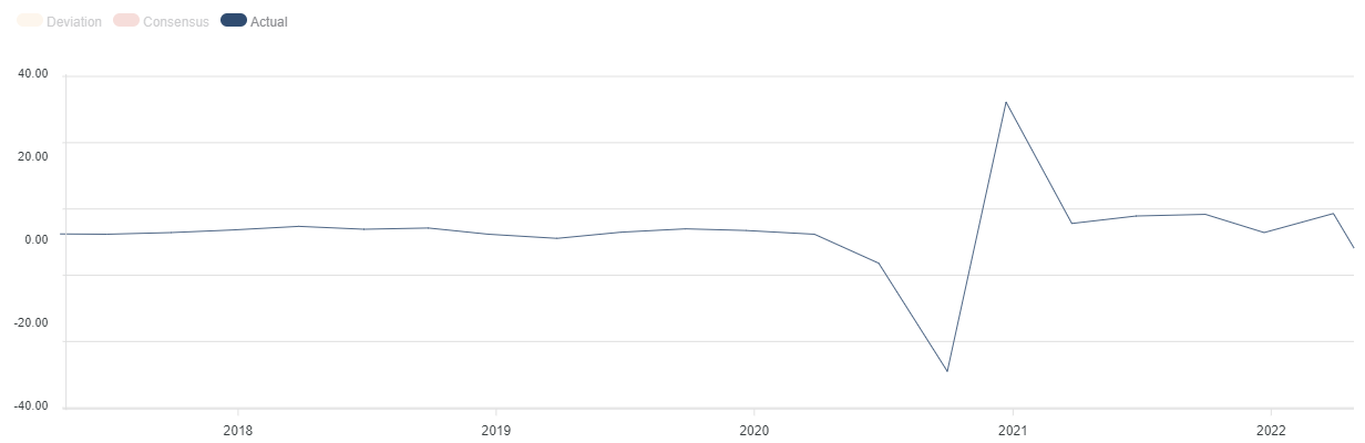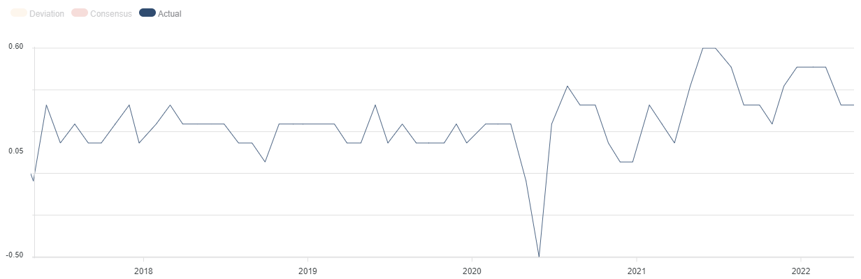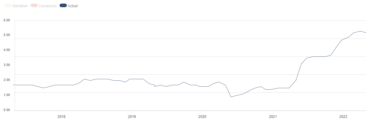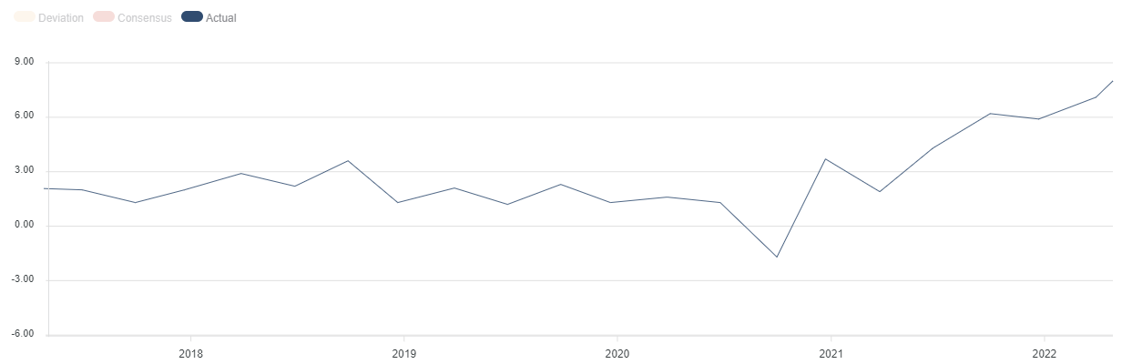 Continua la pressione inflazionistica sui prezzi nel primo trimestre 2022. Il dato preliminare dell’indice dei prezzi del PIL segna una crescita dell’8%, quindi al di sopra del consensus fissato al +7,3% e al dato del quarto trimestre 2021 di +7,1%.