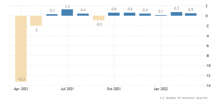 A livello annualizzato, invece, la crescita di marzo è stata del 5,2%, ovvero appena inferiore al consensus fissato al +5,3% e alla crescita di febbraio del 5,3% (dato rivisto da +5,4%). I dati sono rilasciati dall’U.S. Bureau of Economic Analysis.