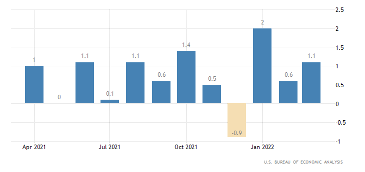 Il dato mensile sulla spesa personale, invece, a marzo sale dell’1,1%; sopra al consensus del +0,7% e alla crescita di febbraio dello 0,6% (rivista da 0,2%). I due dati sono rilasciati dall’U.S. Bureau of Economic Analysis.