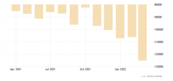 Spaventoso il deficit commerciale sui beni di Marzo. Ben 20 mld $ sopra le attese e ai massimi storici assoluti. Se associamo il dato con la robusta crescita delle scorte all'ingrosso e al dettaglio di Marzo (dopo un febbraio altrettanto forte), ne viene fuori chiaramente un quadro di accumuli di beni da parte di aziende e consumatori in USA per paura che: 1) i prezzi salgano; 2) la guerra e i lockdown in CINA rallentino le consegne.