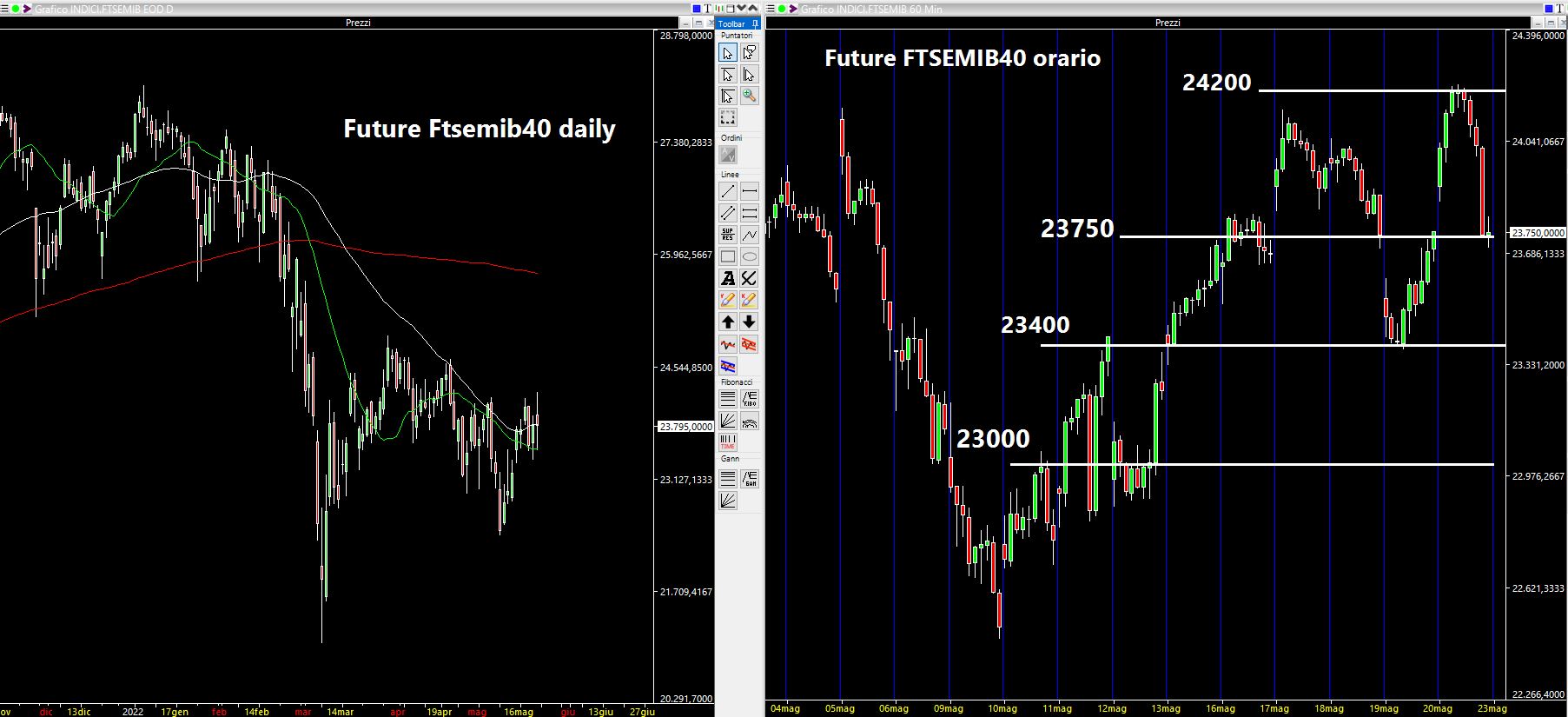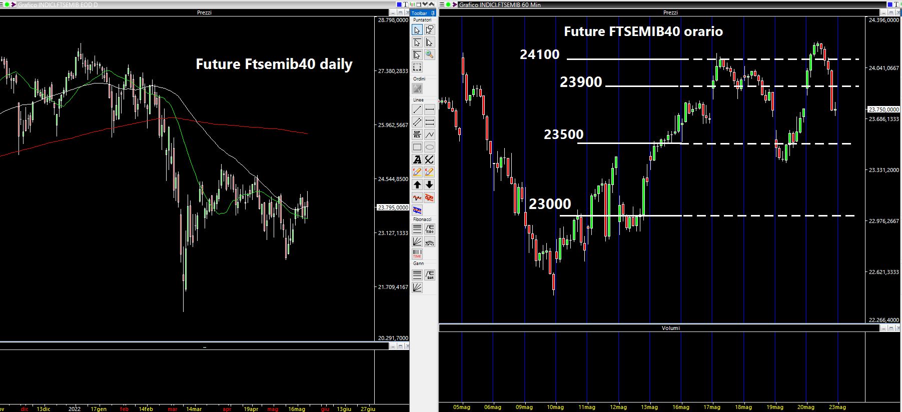 Per le prossime sedute monitorerò i 24200 (massimi settimanali), i 23400 (minimi settimanali) e poi come area baricentro quella dei 23750. I 23000 al momento rimangono un punto supportile che non escludo possa essere raggiunto. Di seguito il grafico daily ed orario.