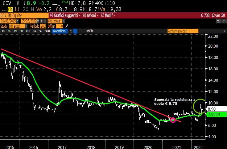 Dopo una lunga fase laterale, ad aprile 2022 il titolo ha sfondato a rialzo il livello € 8,75 estendendo la corsa fino a quota € 9,35. Da lì c’è stata una fase di correzione che ha riportato il titolo in prossimità del supporto.