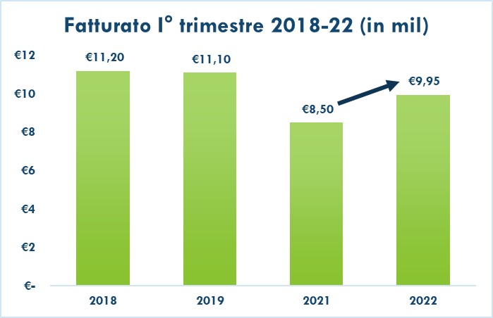 Malgrado in termini di volume d’affari i livelli pre-Covid 19 siano ancora distanti, sotto il profilo della marginalità, il I° trimestre 2022 ha evidenziato il superamento dei livelli raggiunti del 2019.