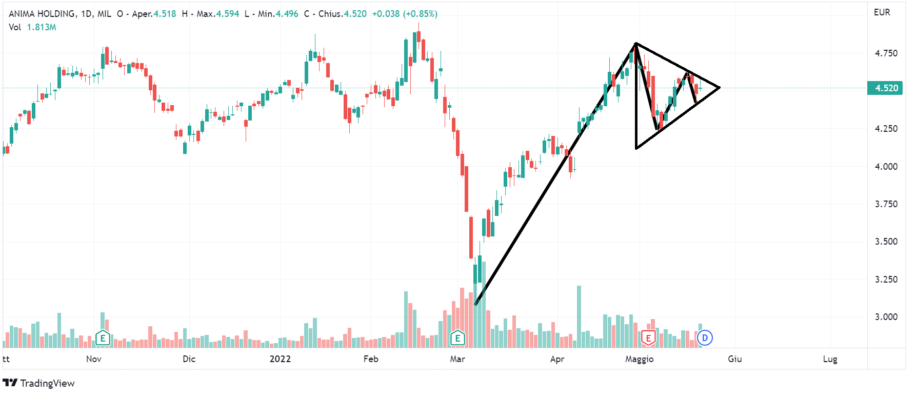 La quotazione del titolo da metà febbraio ad inizio marzo ha registrato un crollo quasi verticale; in termini numerici, si è passati dal massimo di 4,9510 toccato il 16 febbraio al minimo di 3,0750 raggiunto il 7 marzo. Questo minimo ha rappresentato un punto di svolta, dato che il titolo a seguire si è spinto verso l’alto tornando su livelli simili a quelli precedenti alla discesa di febbraio e formando un triangolo simmetrico che al momento è dato da due massimi decrescenti e da due minimi crescenti. Più precisamente, la figura presenta un massimo di 4,8160 datato 29 aprile, seguito dal minimo di 4,2420 del 6 maggio, dal secondo massimo di 4,6220 del 17 maggio e dal secondo minimo di 4,4200 del 19 maggio. L’azienda il 5 maggio ha terminato il programma di acquisto di azioni proprie partito il 1° marzo; nel periodo in questione Anima Holding ha acquistato 6.206.000 azioni proprie, cioè l’1,79% del capitale sociale al 6 maggio 2022.