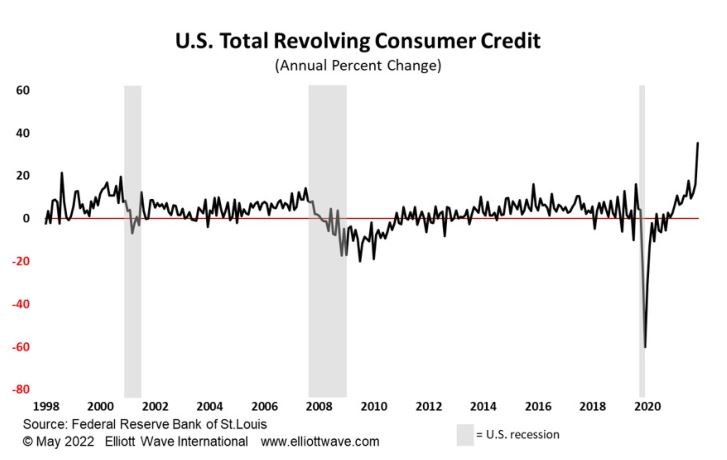 Il grafico sottostante pubblicato sul report europa di Elliott Wave International, mostra come il credito rotativo totale che comprende soprattutto i debiti delle carte di credito si stia gonfiando al ritmo più rapido degli utimi vent’anni. Questo significa che i consumatori stanno esaurendo le carte di credito e contemporaneamente il tasso di risparmio che la pandemia aveva fatto crescere, sta tornando a scendere dal recente picco. Per restare a casa nostra, senza bisogno di andare negli Stati Uniti, se conoscete una cassiera di un supermercato, vi potrà facilmente confemare che all’inizio della pandemia si formavano spesso code, causate da persone anziane che costrette a munirsi di un bancomat per evitare di dover prendere l’appuntamento per andare in banca, poi arrivavano alla cassa e non si ricordavano il pin oppure lo digitavano sbagliato etc.. Oggi, che il pin l’hanno imparato e sbagliano di meno, le file sono provocate dal fatto che sempre più spesso dopo aver digitato il pin appare la scritta “credito insufficiente”… avanti così, verso la catastrofe ma …. con ottimismo! … volete l’aria condizionata o la pace?...