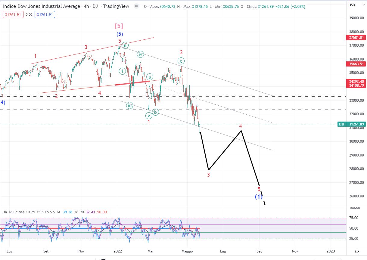 Per quello che riguarda i nostri grafici (mi riferisco a tutti e tre gli indici) se l’onda 3 non dovesse essere la più lunga delle tre onde impulsive, allora potremmo avere a breve un bel rimbalzo di onda 4 che ci accompagni in questi mesi estivi, per rimandare la stangata a settembre/ottobre. Per cui manteniamo la posizione short sul Dow e vediamo come evolve il modello d’onda.