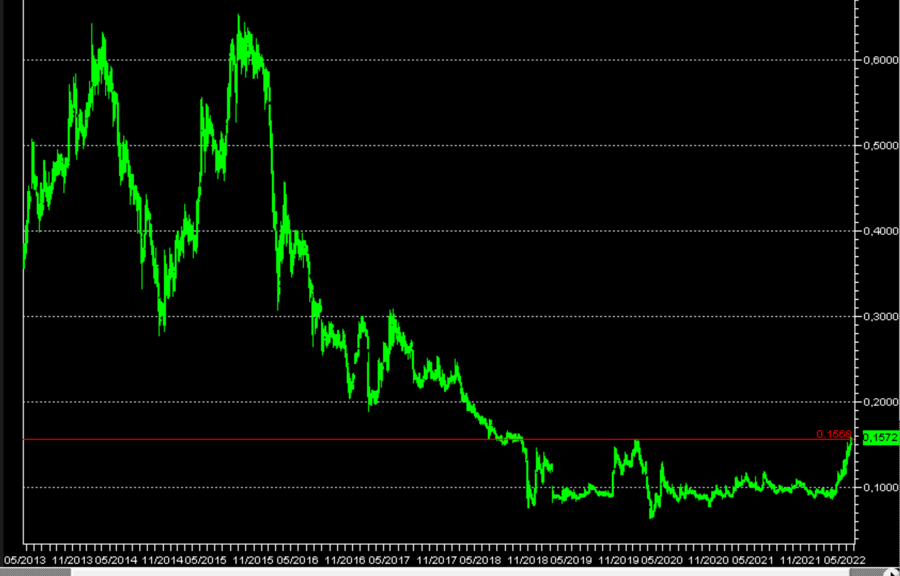 Ha già vissuto un bel perido di rimbalzo dai punti di minimo, portandosi a ridosso dei 0,16€ e già, è bene dirlo, sembra ver fatto molto, seppur, in un timeframe di lungo periodo, evidenzi la possibilità di ben più ampie possibilità, ma se e quando accadrà sarà solo il mercato a deciderlo e le condizioni in cui andrà ad esprimersi.
