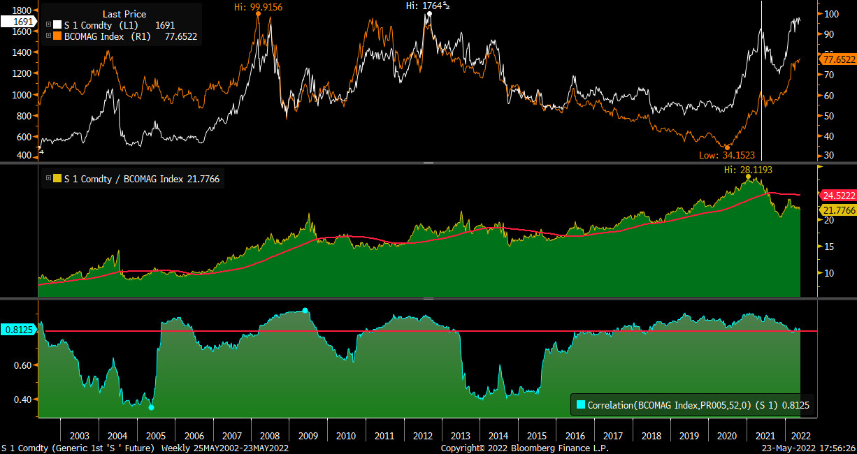 Il primo grafico mostra la relazione degli ultimi 20 anni tra la commodity e il suo sotto indice di riferimento, mentre osserviamo (grafico centrale) un calo di forza relativo del soybean dovuto alla flessione accusata durante le seconda metà del 2021. Anche la correlazione ha parzialmente risentito il colpo, mentre test ora l’importante soglia di 0,80%.