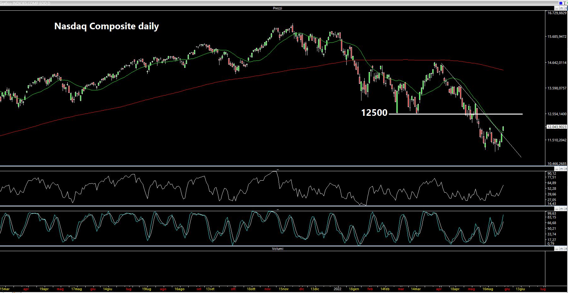 Tornando all'indice Nasdaq Composite le prime resistenze sono collocabili attorno a 12500 punti (ammesso naturalmente che ci sia la volontà di testarle).