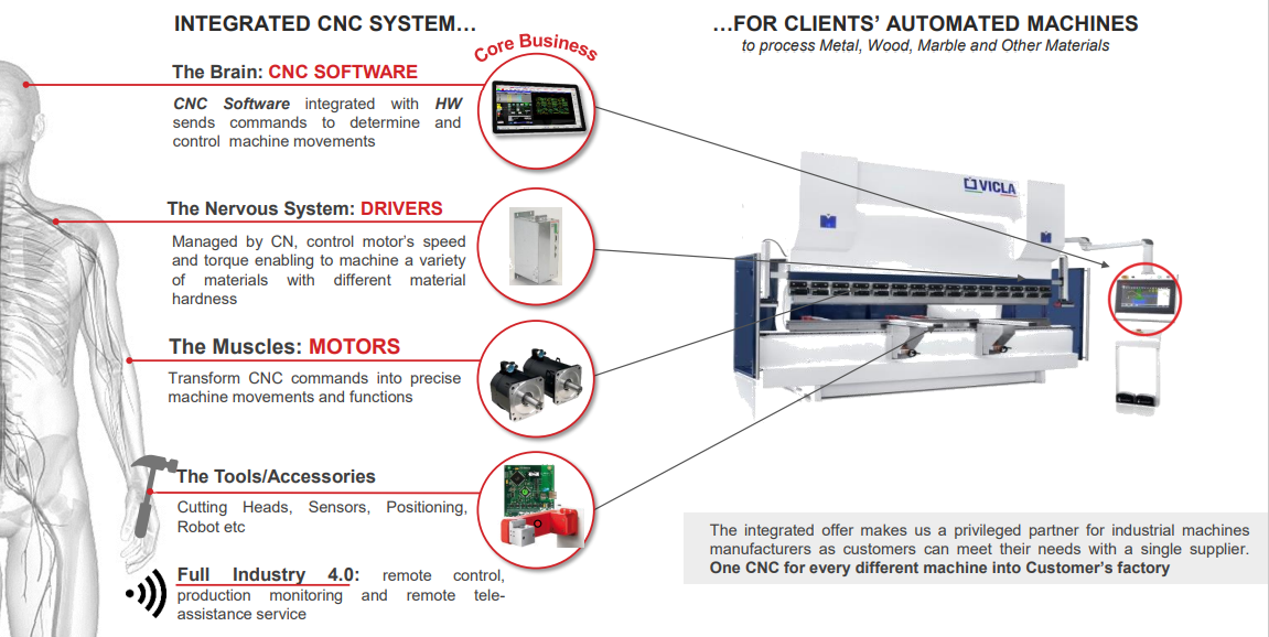 La società sviluppa e vende sistemi integrati di Controllo Numerico Computerizzato (CNC). Si tratta di dispositivi software e hardware che costituiscono il core di soluzioni meccatroniche per l'automazione di macchine per la produzione industriale nei mercati delle lamiere (pressatura, piegatura, taglio), della lavorazione legno, marmo, vetro e robotica.