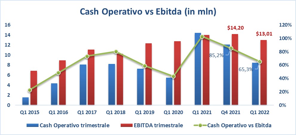 Rapportando tali valori con l’EBITDA prodotto, nell’ultimo trimestre si nota una contrazione (65% vs 85% nel IV° trimestre). Tale valore è però allineato con quanto riportato nei Q1 nei precedenti esercizi.