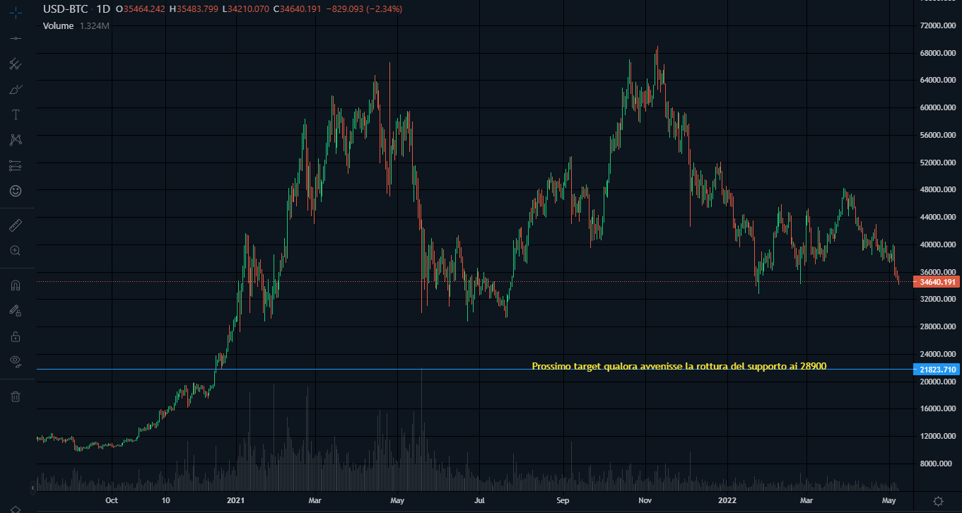 Al momento il Bitcoin sta ballando sui 34600 $ e tutto sembra presagire un nuovo ritorno al supportone fissato ai 28900 che in questo vecchio studio era stato un'area di rimbalzo che si era fermata poco sopra il target che gli avevamo affidato, in area 44000$.