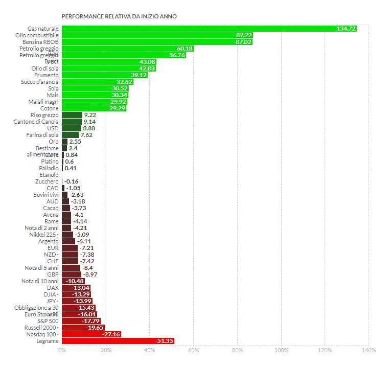 Sulle commodity pur con qualche difficoltà su alcuni conteggi, tutto sommato non ci possiamo lamentare. Dall’inizio dell’anno ad oggi se osserviamo la statistica dei vari future le commodity energetiche, e i grani, l’hanno fatta da padroni. Non male nemmeno alcuni coloniali, mentre il semestre è stato decisamente opaco sui metalli preziosi e sul rame. Ma in ogni caso, tutte hanno fatto decisamente meglio di qualsiasi indice azionario e di qualsiasi obbligazione. Piuttosto che insistere su questi titoli, sarebbe stato più redditizio, all’inizio dell’anno, comprare banalmente dei Dollari… ebbene sì il tanto criticato e vituperato biglietto verde che un giorno o l’altro sarà carta straccia, ma intanto prima di tirare le cuoia, riesce ancora, restando valuta di riferimento, a ripagare gli investitori con un rotondo 8,88% dall’inizio dell’anno. Metto il grafico qua sotto così che ognuno potrà fare le sue considerazioni.