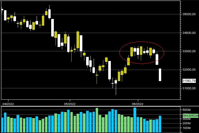 L'immagine, ben diversa dagli indici targati Usa, evidenzia un trend following alimentato da algoritmi impostati ancora sul Quantitatve Easing, sebbene si fosse alle porte di una sua fine. Evidente come in 3 giorni si sia riallineato perdendo 1000 punti in maniera brutale, e non vi è appello per i longeur rimasti appesi al soffitto di questo lembo ai 14700. Crudeltà della borsa ma anche pane per operatori capaci che sanno come e quando usare l'altro tasto dei book, quello che pigia sul martello del sell.
