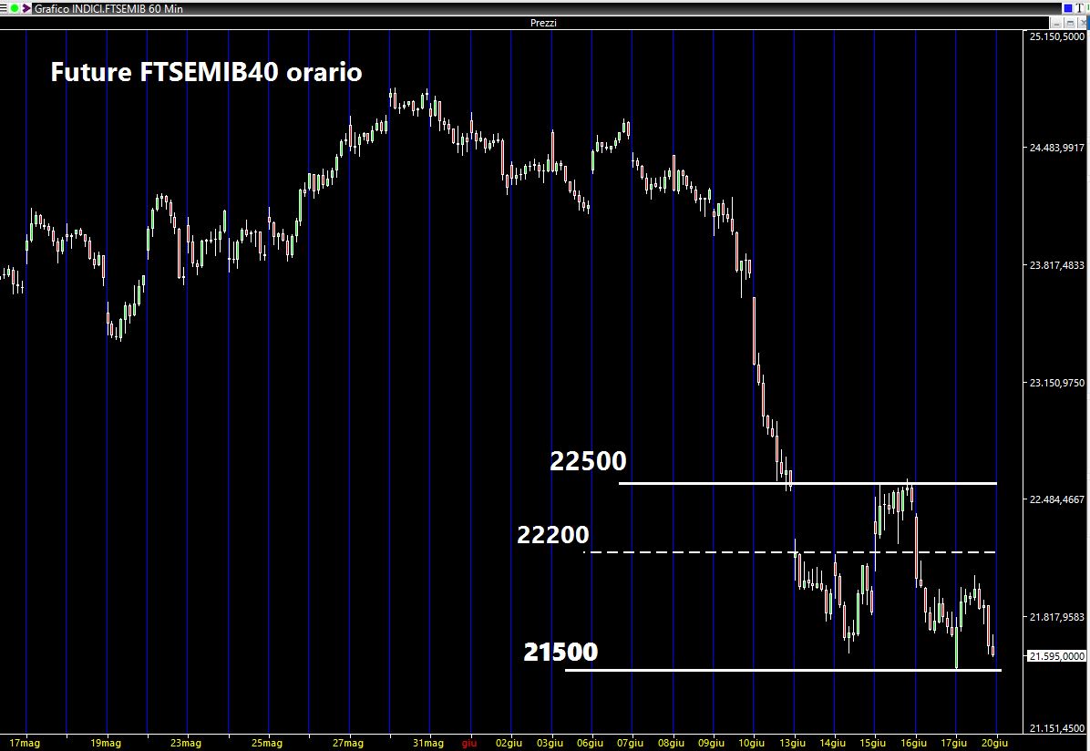 "Ribassi così forti a ridosso della settimana di scadenze non fanno mai bene. Possibile quindi una ulteriore estensione del ribasso, magari in modo meno violento, verso i 21700 (minimi di metà febbraio). "