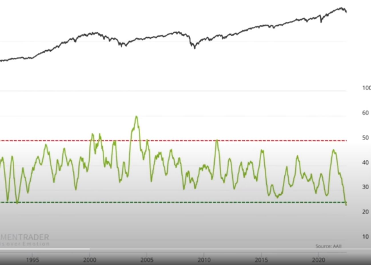 Guardate poi nel grafico seguente dove si trova il numero di operatori rialzisti (oscillatore di colore verde): su minimi che non si vedevano dagli anni '90, segno che siamo comunque ad un eccesso di pessimismo nella psicologia degli operatori (fonte: SentimenTrader). Ovviamente questo è un indicatore di psicologia di massa. Non sto dicendo che il mercato non possa scendere ulteriormente ma questa capitolazione e fuga di massa è ad un eccesso.