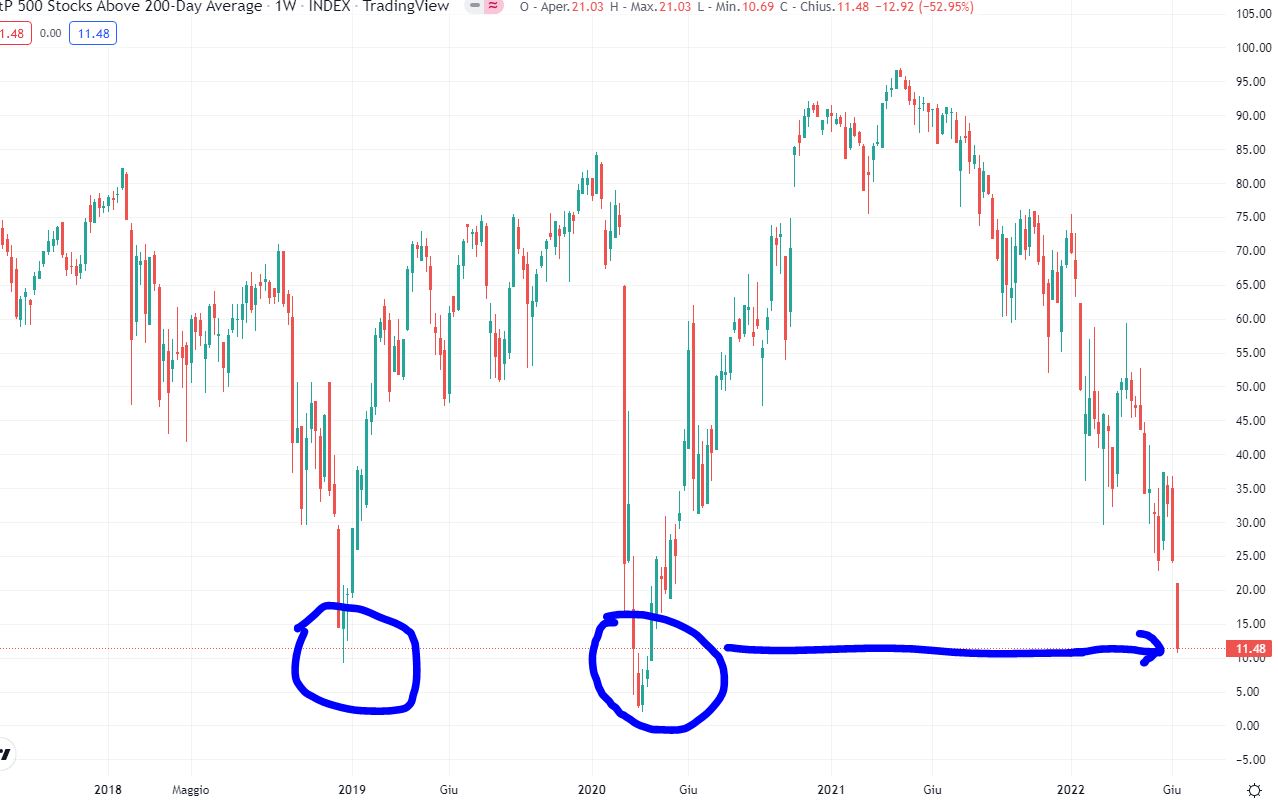 Continuo poi a far notare che se osserviamo il numero di azioni dell'S&P500 che si trovano al di sopra della media a 200 periodi (scala weekly), ci troviamo a livelli che non si vedevano dallo scoppio della pandemia nel 2020. Tali rilevazioni sono state riscontrate molto raramente nel lontano passato e spesso hanno dato l'opportunità per un recupero veloce. Certamente questa volta abbiamo molti elementi da considerare (non uno solo come è stato nel 2020 quando è scoppiato il Covid): blocchi nelle catene di approvvigionamento, guerra, inflazione (che credo sia ad un punto di picco e quindi destinata a rientrare mano a mano).