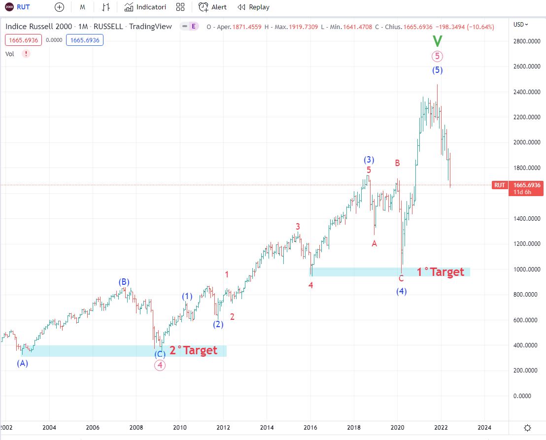 L’ottava appena conclusa ha visto gli indici americani scendere rispettivamente del 4,79% per quello che riguarda il DJIA, del 5,79% sull’S&P500 e del 4,78% sul Nasdaq Composite. A questo punto alcuni indicatori di breve termine indicano un mercato in ipervenduto ed altri indicatori di sentiment mostrano misure di ottimismo piuttosto basse. Tutto questo è comunque abbastanza in linea con quanto ci si può attendere da un mercato ribassista di alto grado nel corso di una terza ondata. Anzi se vogliamo dircela tutta, siamo piuttosto colpiti dal quanto sia stato ordinato finora il declino del mercato azionario e il vero e proprio panic-selling per ora è mancato. Questo dato risulta evidente anche se si consulta il grafico del VIX (l’indice della volatilità del Chicago Board Options Exchange. Durante l’onda [4] di grado primario nel calo del 2009 le statistiche emesse dall’American Association of Individual Investors indicavano in un 40,8% la media del denaro ancora allocato in azioni nei portafogli retail. Ora alla fine dello scorso mese di maggio, quello stesso paramentro indicava una media del 67,1% che è ancora un dato molto alto. Molti investitori faticano a comprendere l’entità del potenziale ribassista del mercato. Il principio dell’onda che è un frattale gerarchico, è unico nel consentire a un investitore di valutare le possibili dimensioni dei movimenti di mercato ai diversi gradi di tendenza. Se osserviamo per esempio il grafico del Russell 2000 a partire dal 2000 in poi vediamo le onde [4] e [5] di grado primario a comiciare dal top dell’onda [3]. L’onda [4] ha generato un modello di flat espanso terminato il 9 marzo del 2009, mentre l’onda [5] è stata un classico 5 onde rialzista che si è concluso l’8 Novembre 2021. Una delle Linee Guida di Elliott individua dopo la fine di un’onda quinta di impulso un probabile obiettivo nel fondo della quarta ondata di grado inferiore; nel nostro caso la correzione dell’onda [5] ha quindi un suo target naturale attorno al minimo dell’onda (4) ovvero nella fascia 943-966 punti, mentre per correggere l’intera onda V di grado cycle, occorre scendere verso il minimo dell’onda [4] (del 2009) nella fascia 325-343 punti. Se poi si sale al grado si Superciclo, l’obiettivo di ritracciamento andrà cercato attorno ai minimi dell’onda IV di grado Cycle non visibile sul grafico. Dal momento che il massimo di novembre chiude anche la terza di gran superciclo, occorre cercare la conclusione della quarta di superciclo che è ancora più giu. Se si fa questo esercizio sul Dow Jones dove è più facile reperire la serie storica dell’ultimo secolo, quel minimo si colloca sotto quota 1000 punti. Questo è, a torto o a ragione, ciò che recita il principio dell’onda. La verità la scopriremo solo vivendo.