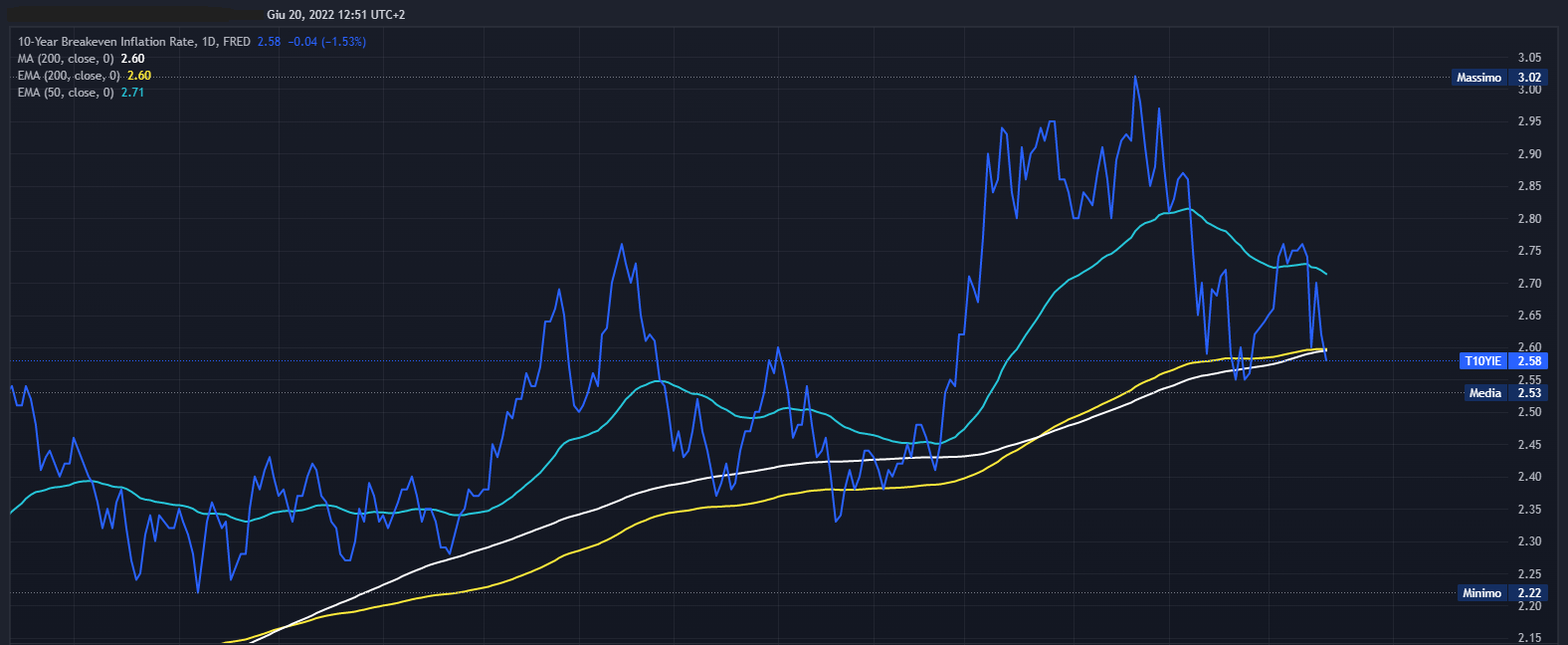 Anche il rendimento del Treasury a 10 anni legato all’inflazione, dopo la decisone della FED, scende passando dal 2.70% al 2,58% della chiusura settimanale.