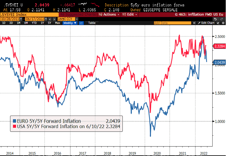 Concludendo, la FED sta alzando aggressivamente i tassi (e riducendo il bilancio) a fronte di un’economia che è già in fase di raffreddamento per il calo dell'impulso fiscale, aggravato dall'impatto dell'inflazione sui consumi. Quindi, avrà successo nel far calare l'inflazione, ma a discapito di un’economia che rallenterà parecchio, se non si ferma in tempo. E fermarsi quando l'inflazione ha già cominciato a scendere in maniera convincente, è troppo tardi, visto che la politica monetaria ha un effetto ritardato sul ciclo e uno ancora più ritardato sull'inflazione. Non a caso, se uno guarda quelli che sono considerati i principali indicatori delle aspettative di inflazione, ovvero i 5 anni “forward”, notiamo che quello USA ha fatto il picco nel 2021 e lo ha ritestato ad aprile, ma ora staziona sul 2.3%, mentre quello EU non dista troppo dal 2%, target ECB (v. grafico):
