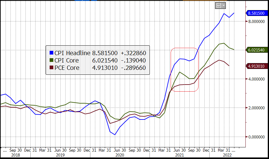 Settimana, quella appena trascorsa, molto complicata sui listini azionari USA e mondiali che hanno registrato nuovi minimi di periodo. Il motivo dominante è, ovviamente, il tightening (o stretta) delle banche centrali sulla politica monetaria. Sotto quest'aspetto in settimana il caso è stato emblematico. Su un mercato che stava digerendo il primo aumento dei tassi da 75 bps da parte della FED da 28 anni a questa parte, hanno impattato il rialzo a sorpresa della Swiss National Bank, da 50 bps, e quello da 25 bps della Bank of England, atteso, ma con 3 membri su 9 che desideravano fosse di 50 bps. Il tutto, con un ciclo economico che ha già passato il momento migliore e l'inflazione elevata a deprimere il mood dei consumatori. Aggiungiamoci che i dati macro stanno iniziando a dare segnali di rallentamento, con il prezzo del Petrolio e del Gas che perdono rispettivamente il – 9% ed il – 20% nella scorsa settimana, ed ecco spiegata l'enorme ansietà degli investitori dell'ultimo periodo. Come riportato diverse volte su queste colonne, il timore è che le banche centrali, FED in testa stiano commettendo un altro, enorme, errore di policy. In quanto il primo errore, clamoroso, lo hanno fatto l'anno scorso, parlando per 6 mesi da marzo a settembre, di una fase di inflazione temporanea dovuta al post Covid e ai cosiddetti colli di bottiglia. In realtà, sicuramente questi fattori hanno avuto un ruolo rilevante, come lo ha avuto la guerra nel prolungarne gli effetti. Ma la vera causa di quest'ondata di inflazione è stata, a nostro modo di vedere, un’esplosione dello stimolo fiscale causata dal Covid, costituito da larghi importi di "helicopter money" o aiuti monetari a pioggia (assegni, sussidi), che sono perdurati anche quando l'economia già accelerava forte (l'ultima erogazione negli USA è avvenuta a marzo 2021). A fronte di ciò, la FED ha tenuto i Fed Fund a zero e QE al ritmo di 120 mld $/mese fino a novembre, quando già in estate 2021 l'inflazione era sopra il 5% e quella “core” sopra il 4% il doppio del target dato dalla FED (vedi grafico):