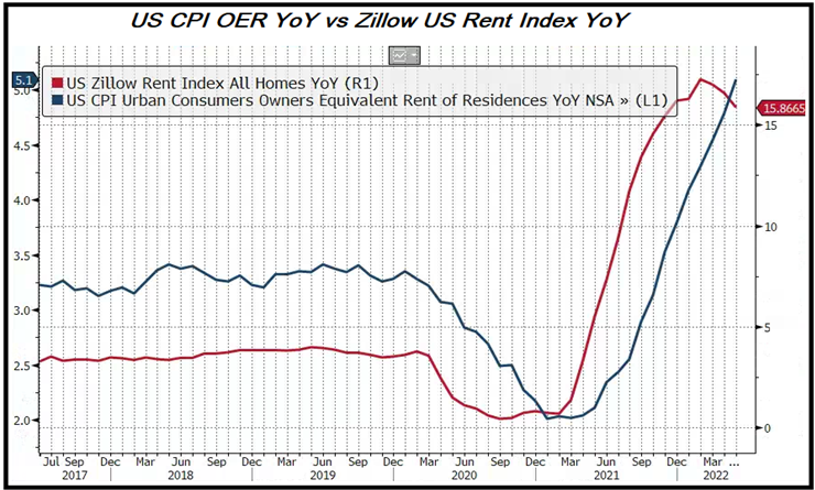 Per fare un esempio, prendiamo la categoria degli alloggi. Il crollo dei tassi ha fatto esplodere il mercato immobiliare, i prezzi delle case sono volati andando a gonfiare i CPI fino al record di maggio 2022, ma l'indice di Zillow (v. grafico sotto) ha cominciato a ripiegare e sembra indicare che, di qui all'autunno, il contributo di questa componente nel CPI dovrebbe iniziare a decrescere, anche perchè i numeri dell'immobiliare stanno implodendo, con il tasso sui mutui che sta per arrivare al 6% e con un’enorme offerta di vendita di case che sta arrivando sul mercato, a premere ulteriormente sui prezzi.