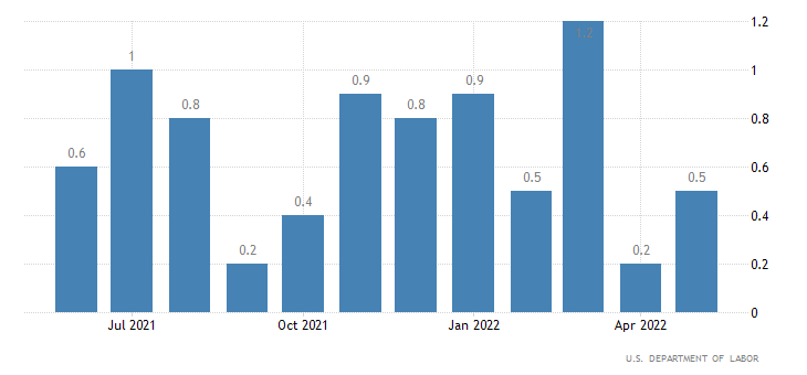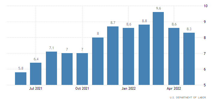 A livello annualizzato, invece, la crescita di maggio è stata dell’8,3%, anche in questo caso inferiore al consensus, fissato al +8,6%. Ad aprile era stato registrato un rialzo dell’8,6% (rivisto da +8,8%). Il dato è rilasciato dall’U.S. Bureau of Labor Statistics.