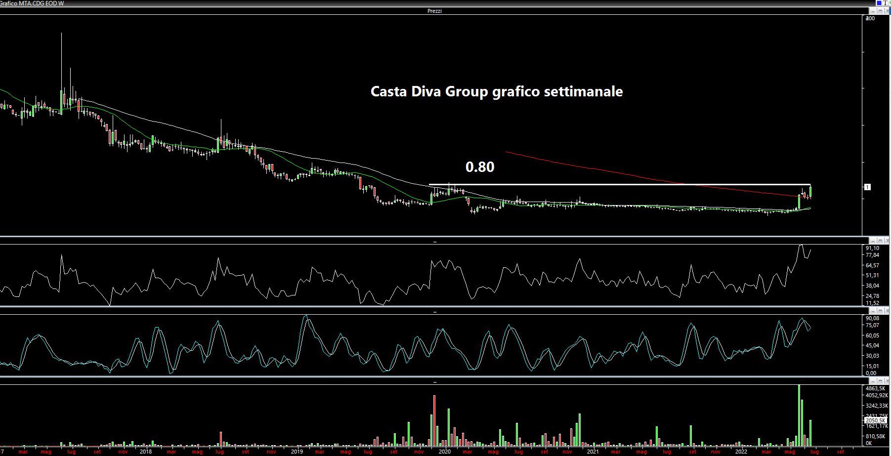 L'altra azione di cui ho scritto verso la fine di maggio è Casta Diva Group su cui oggi una nota casa d'affari ha dato un target superiore all'euro. E così abbiamo un bel +21% di salita a 0.80 euro ad azione ed un'area target centrata e mai andata in stop dal primo articolo in cui il titolo è stato menzionato (link: https://www.lombardreport.com/2022/5/28/previsione-inflazione-azioni-moncler-azioni-poste-azioni-iveco-azioni-casta-diva/). Anche in questo caso dopo un rialzo a doppia cifra (non decimale) il money management imporrebbe di portare a casa il 60%-70% e lasciare a mercato il resto, alzando lo stop a 0.55 euro.