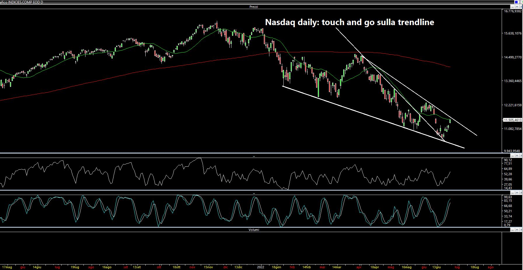 Con il senno del "poi" è tutto più facile ma possiamo dire di aver centrato i minimi di questo rimbalzo anche se chiaramente non sappiamo fino a quando durerà e fino a dove si estenderà, anche se la tendenza al rialzo/attenuazione delle vendite è maggiore nelle ultime sedute del mese. Come scrivevo la settimana scorsa, l'ottava di giugno post scadenze è statisticamente orribile ma questa volta erano maggiori le probabilità che le cose potessero andare diversamente. Così è stato con i mercati americani che hanno mostrato ben pochi tentennamenti al rialzo. Quanto si estenderà? Forse il tempo di chiudere un piccolo gap down o poco più. La Borsa è un libro e lo si legge quotidianamente per non perderne la trama. Non sappiamo quando finirà, anche se, come tutte le cose belle o brutte della vita ci sarà comunque un termine.