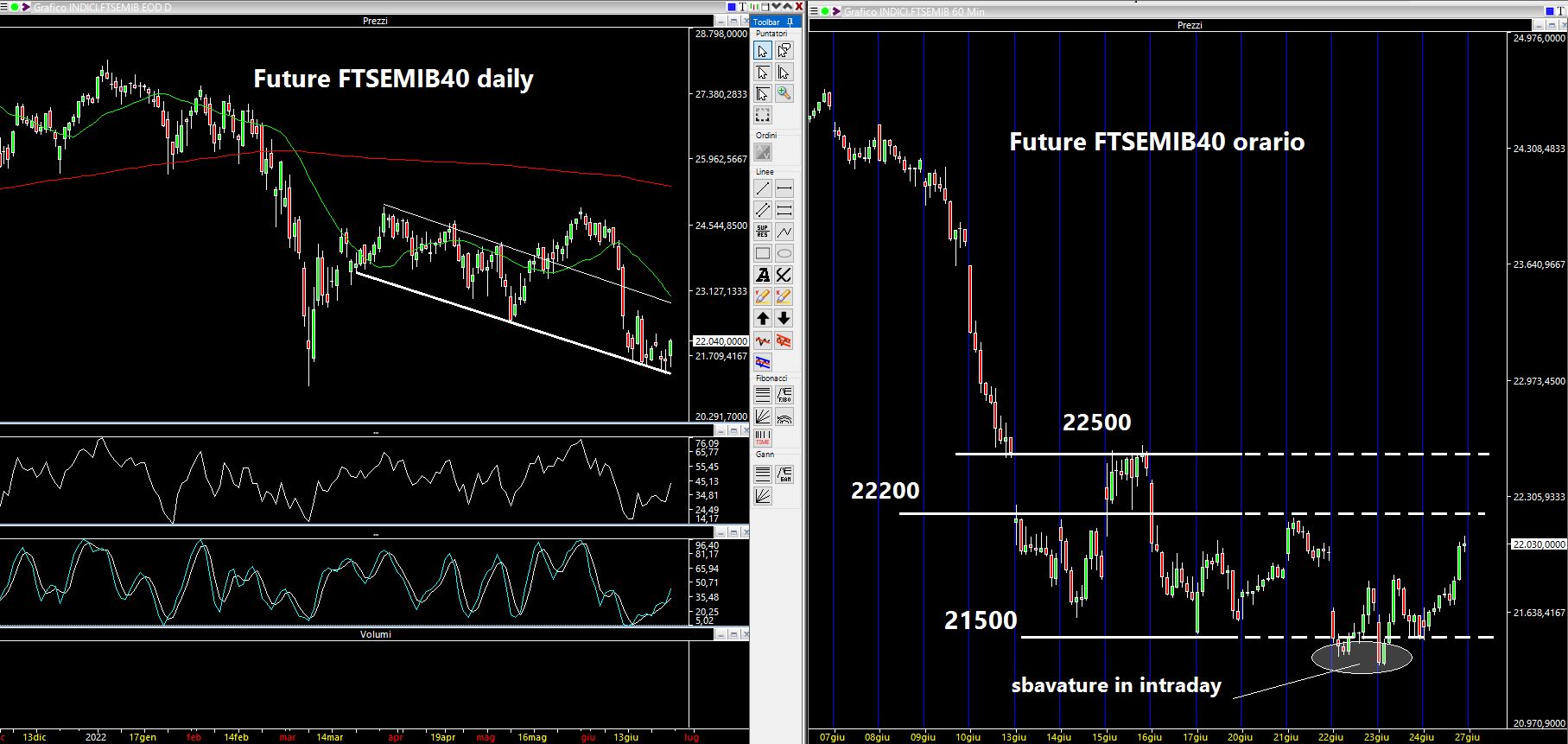 Dal canto suo il mercato italiano è riuscito a rimbalzare nelle ultime ore di venerdì, dopo aver cercato di bucare supporti importanti senza mai riuscirci fino in fondo, tant'è che le chiusure sono sempre state sopra i 21500 punti indicati nel mio report di sabato scorso. Molta fatica a scendere ed altrettanta a salire, segno di una totale indecisione degli operatori e questo lo si denota come sempre dai volumi scambiati. Le aree indicate sabato erano: 22500 come livello al rialzo, 21500 al ribasso ed infine i 22200 come area intermedia. Di seguito il risultato (come sempre le linee tratteggiate rappresentano l'esito della "previsione").