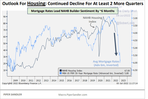 Nel grafico che segue la prospettiva del mercato immobiliare USA per i prossimi 6 mesi: i tassi trentennali sui mutui (linea blu) precedono di 6 mesi il sentiment degli agenti immobiliari USA (linea nera) e se guardate cosa sta facendo la linea blu capite che stanno arrivano tempi cupi per i possessori di case perché tra poco anche la linea nera crollerà seguendo quella blu: