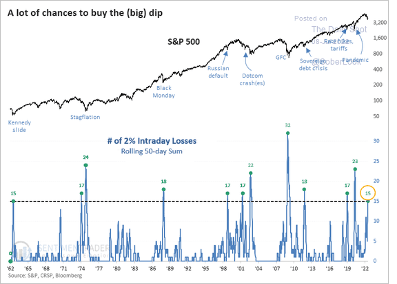 Il grafico che segue vi mostra come quando ci sono dei raggruppamenti di cali del 2% dell’SP500 significa generalmente che siamo sul fondo: ecco i precedenti storici dal 1962 ad oggi