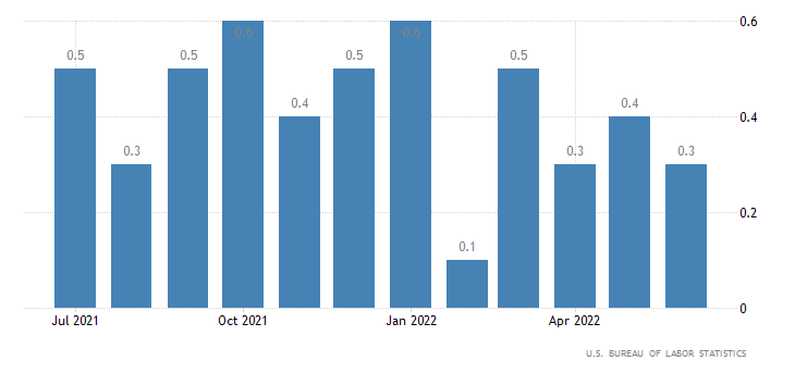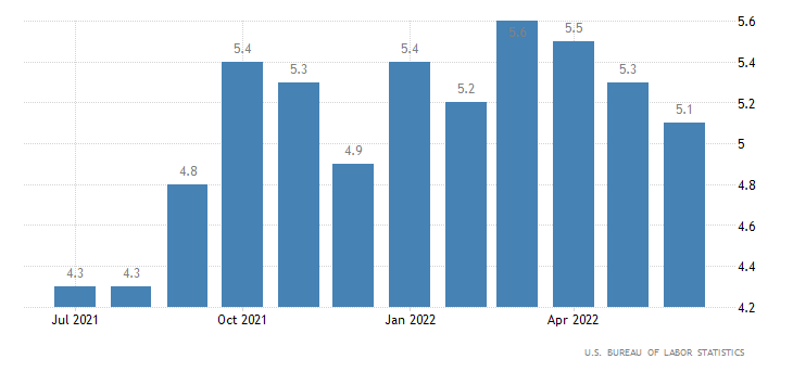 A livello annualizzato, invece, la crescita di giugno è stata del 5,1%, appena superiore al consensus di +5,0%; a maggio la crescita era stata del +5,3% (rivista da +5,2%). I dati sono rilasciati dall’U.S. Bureau of Labor Statistics.