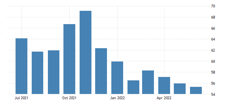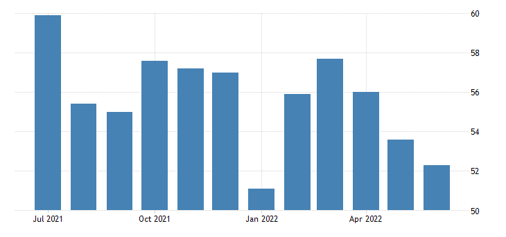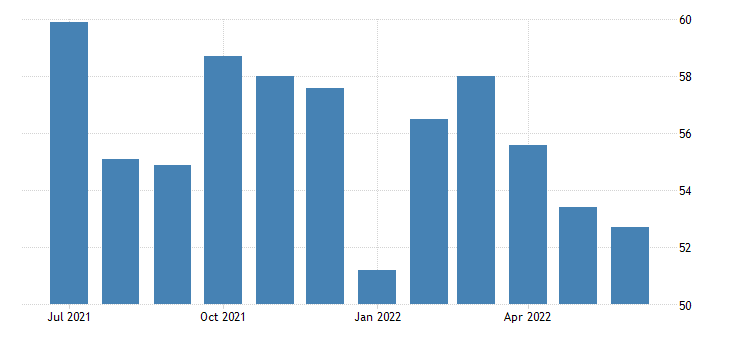 Il dato relativo al settore dei servizi, invece, scivola dai 53,4 punti di maggio a quello di giugno di 52,7 punti (il dato preliminare era di 51,6 punti).